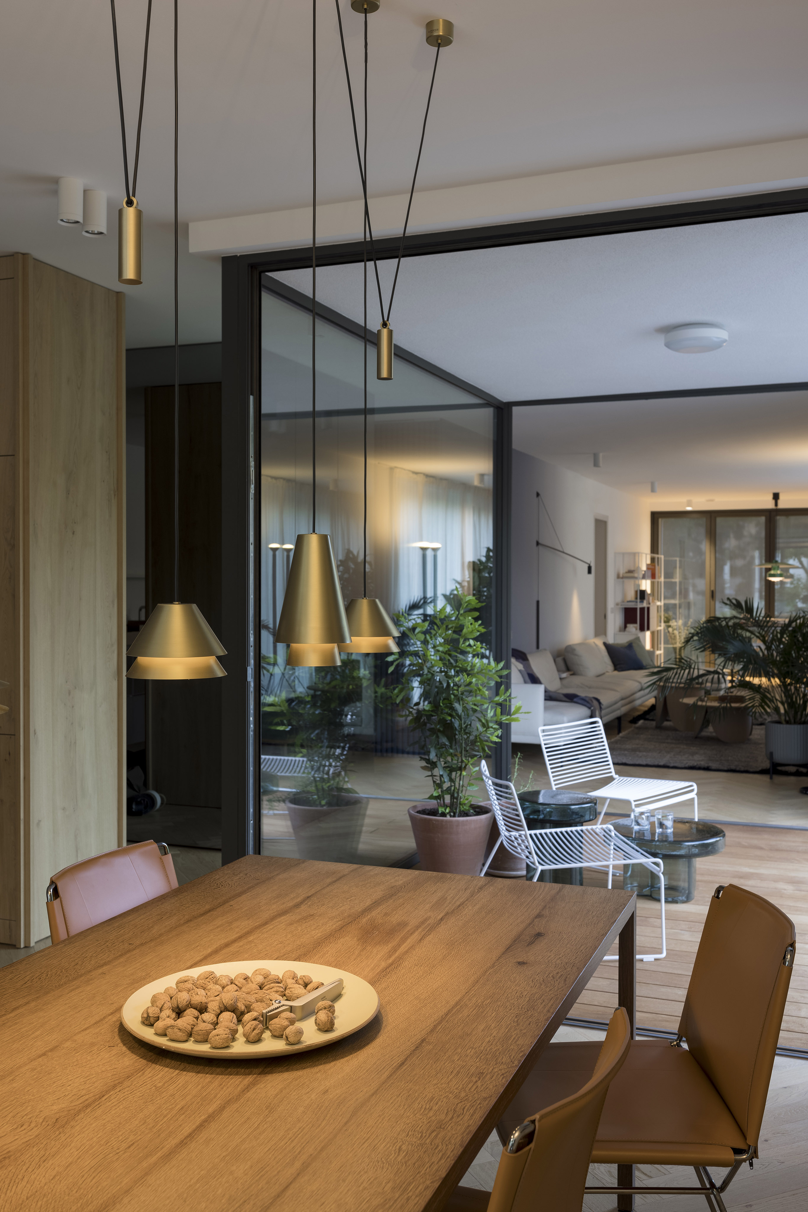 Prostor zaključuje jedilnica v toplih tonih: hrastova miza, usnjeni stoli v barvi konjaka, stena v nežno laneni barvi in drobne medeninaste viseče luči, ki nad mizo delujejo kot nakit.