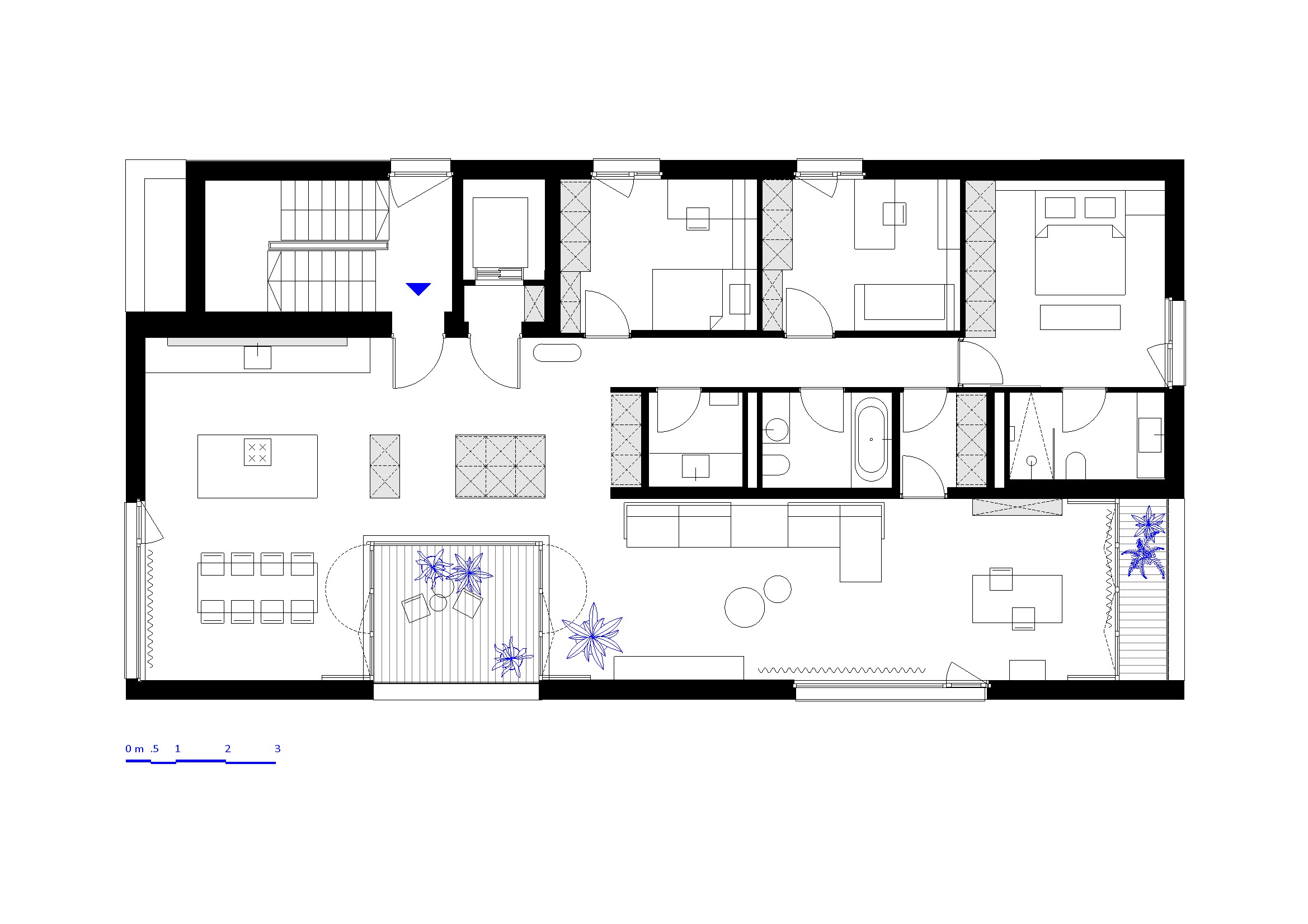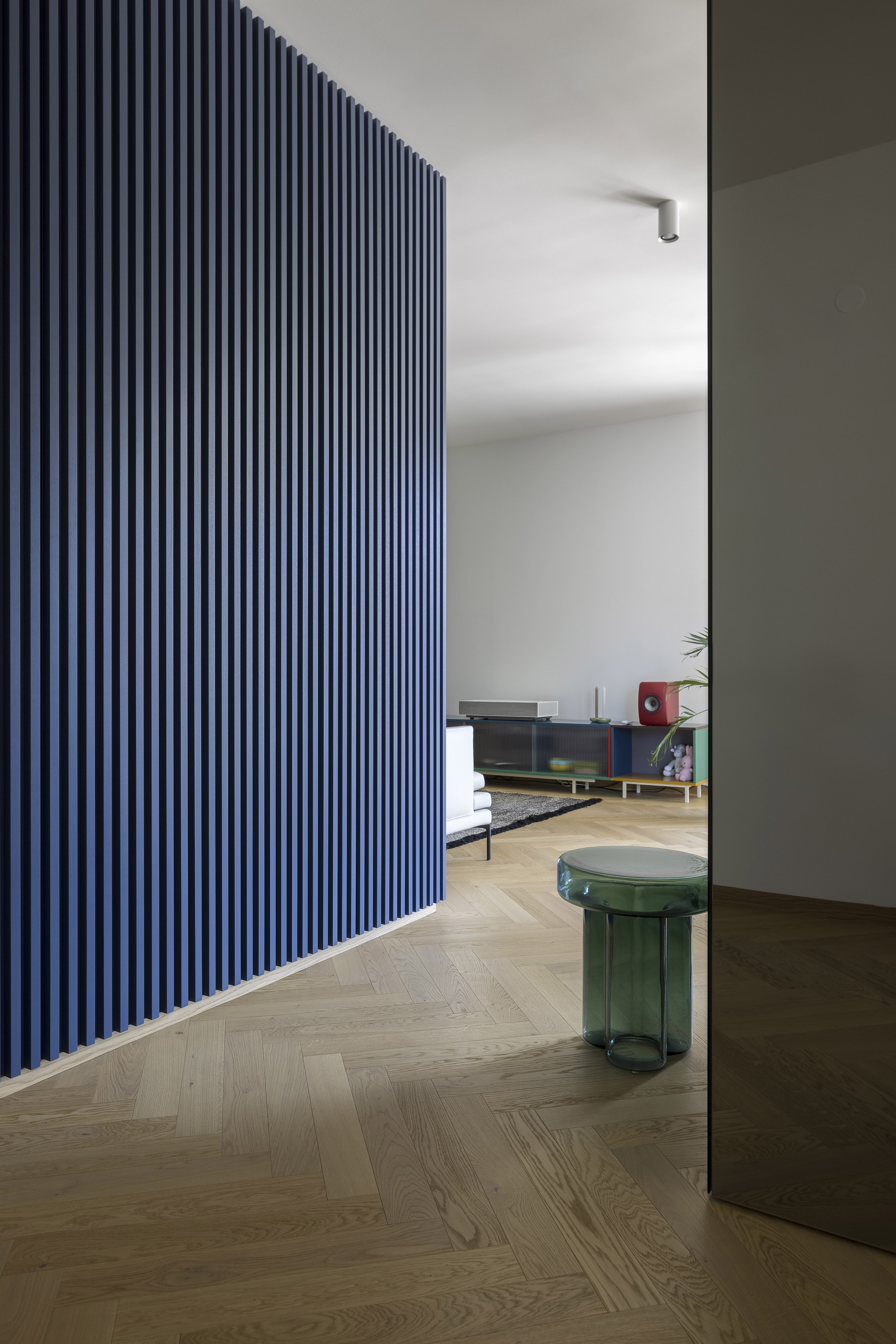 Drugi večji barvni poudarek, kot protiutež otoku, je umeščen v dnevno sobo in sestavljen iz dveh delov – omare v niši in tapete. Ker so naročniki že od začetka želeli uporabo tapet, smo jo umestili na najdaljšo steno stanovanja – 11 metrov dolg del dnevne sobe. Zaradi močnega grafičnega učinka tako velike površine smo izbiri posvetili veliko pozornosti. Končna rešitev je prelivajoča se barvna tapeta – barvni gradient, ki se iz intenzivne temno modre prelije v belo. Vogal dnevne sobe, kjer je barva rebraste omare enaka barvi tapete, tako deluje kot poudarjen kubus, ki v daljavi izginja. Po meri narejena tapeta tvori ozadje različnih namenov rabe dnevne sobe. Zelo dolg in razmeroma ozek dnevni prostor (11 × 4 m) smo programsko razdelili v dva dela, tapeta pa to členitev tudi po videzu podkrepi.